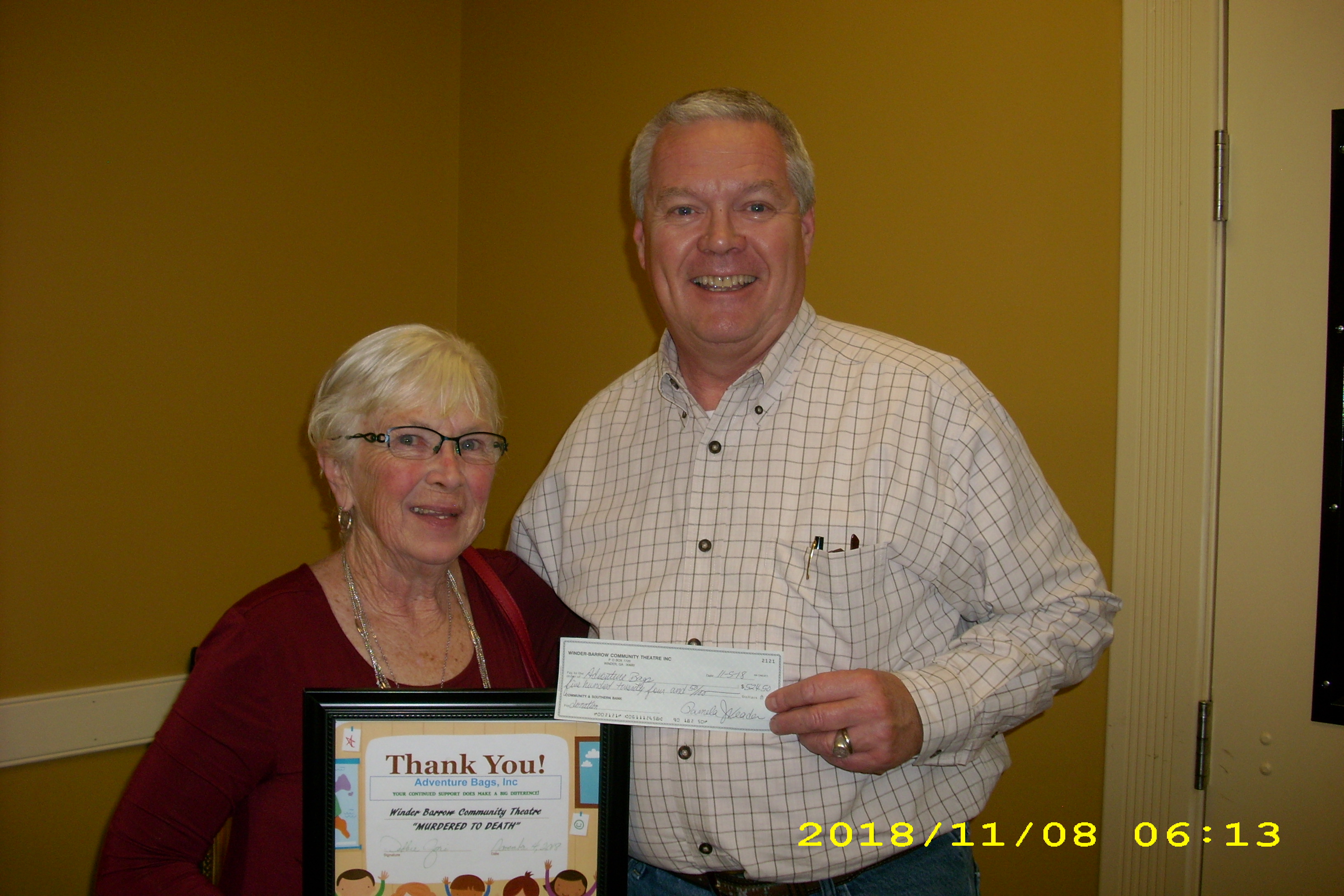 Winder-Barrow Community Theatre recently finished their 2018 Main Stage Season of plays with “Murdered to Death”. A part of the proceeds from this show was donated to Adventure Bags, a nonprofit group which provides a diaper bag or book bag filled with necessary items and a few toys to help provide security and comfort to a child in crisis. These bags are used by firemen, police officers, children’s shelters, and Department of Family and Children Services workers whenever a child is in need. If you want to find out more about this great program, please see their website at www.adventurebags.org or Adventure Bags on FaceBook. You can also contact Debbie Gori at 678-425-0316 to volunteer your time or to donate needed items.