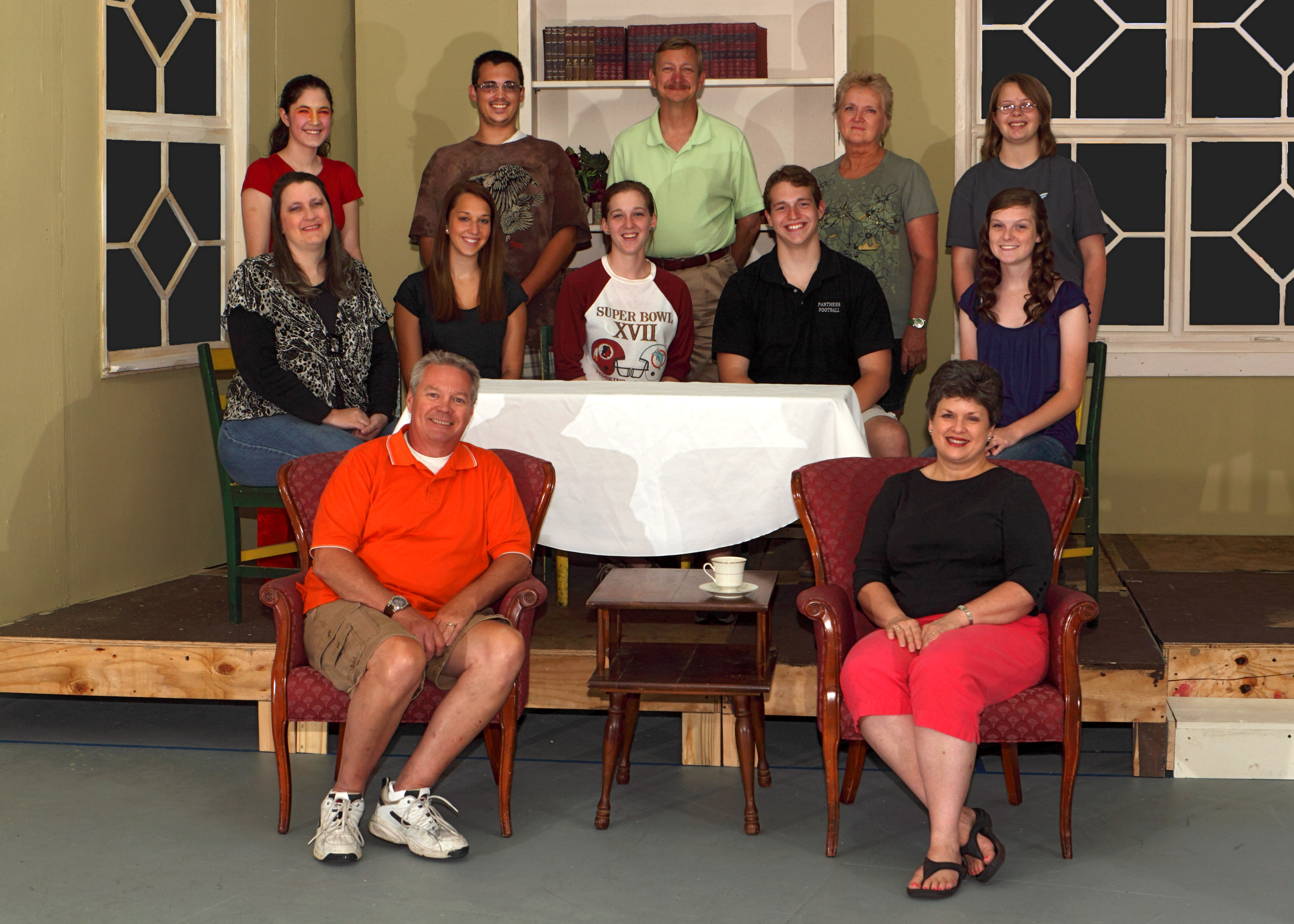 Cast photo of “Father of the Bride” cast posing in the set which is under construction.